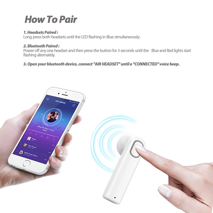 Before your first use, please pair the both earphone headset and then pairing to the mobile phone that supports bluetooth.