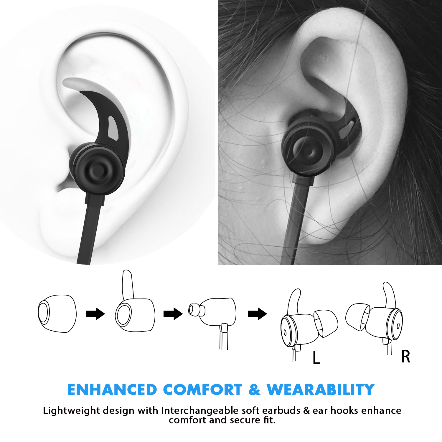 【Enhanced Comfort & Wearability】Lightweight design with interchangeable soft earbuds & ear hooks enhance comfort and secure fit. Newest Version Neckband Headset that makes you feel comfortable when running, jogging or working out.