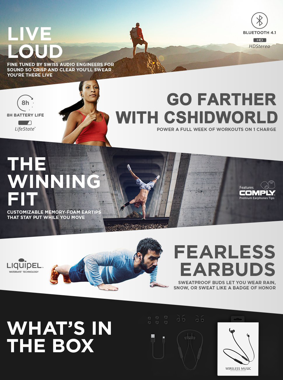 Wireless Earbuds, Cshidworld Bluetooth In Ear Earphones 4.1 Lightweight Neckband Headset Sports Magnetic Headphones for Running Workout(IPX5 Sweatproof, aptX Stereo, Noise Cancelling Mic |
